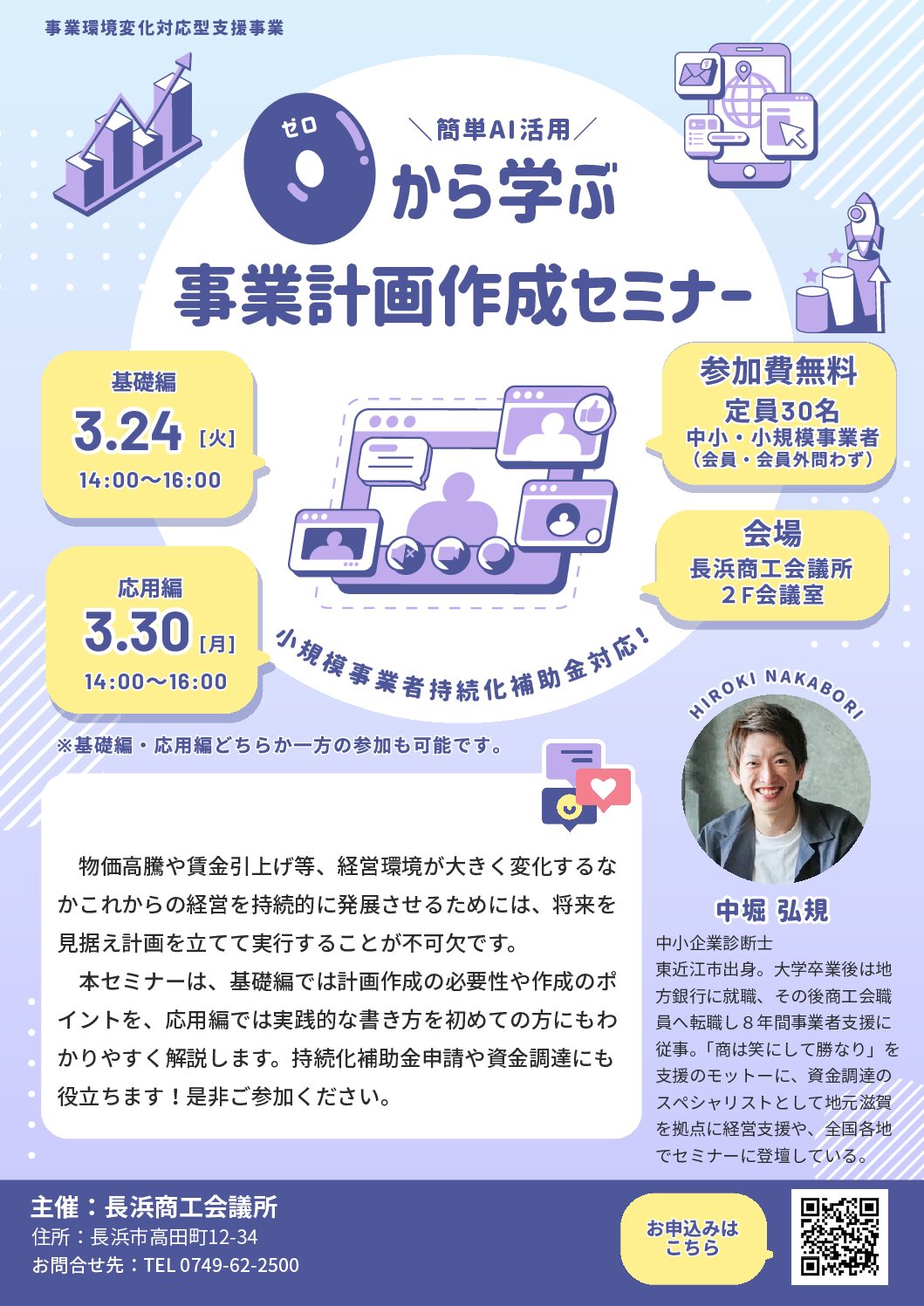 本セミナーは、事業計画の作成が初めての方でもすぐに実践できる内容となっておりますので、補助金申請をご検討の方は是非ご参加ください。