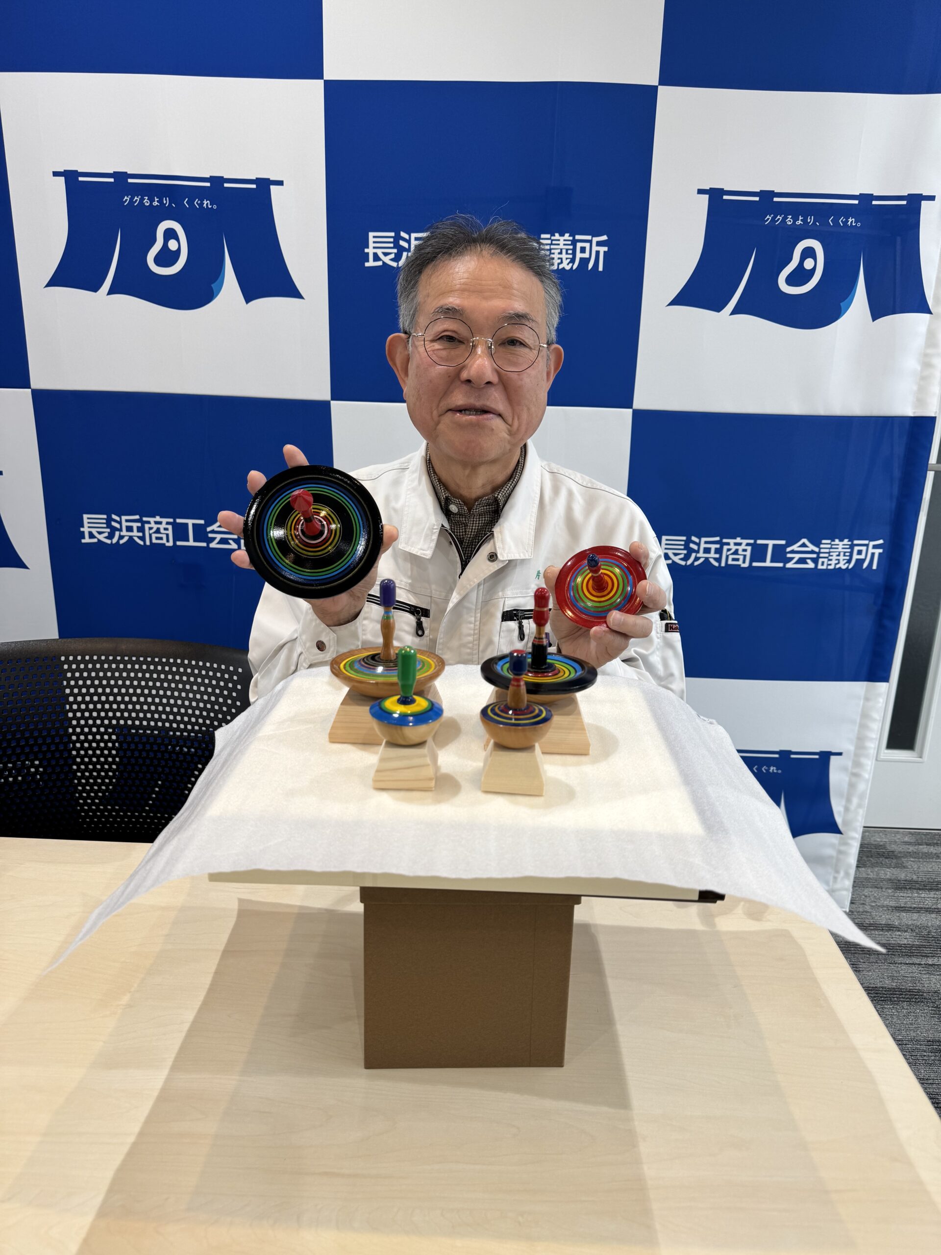 形や絵付けを一つひとつ変化させた独自の独楽”いろ色浜独楽”。1980年頃より、遊んでも飾っても楽しめる工芸品として人気の逸品です(^^)/地産地消をモットーに、伊吹山麓で採れた桜材で作成されています。