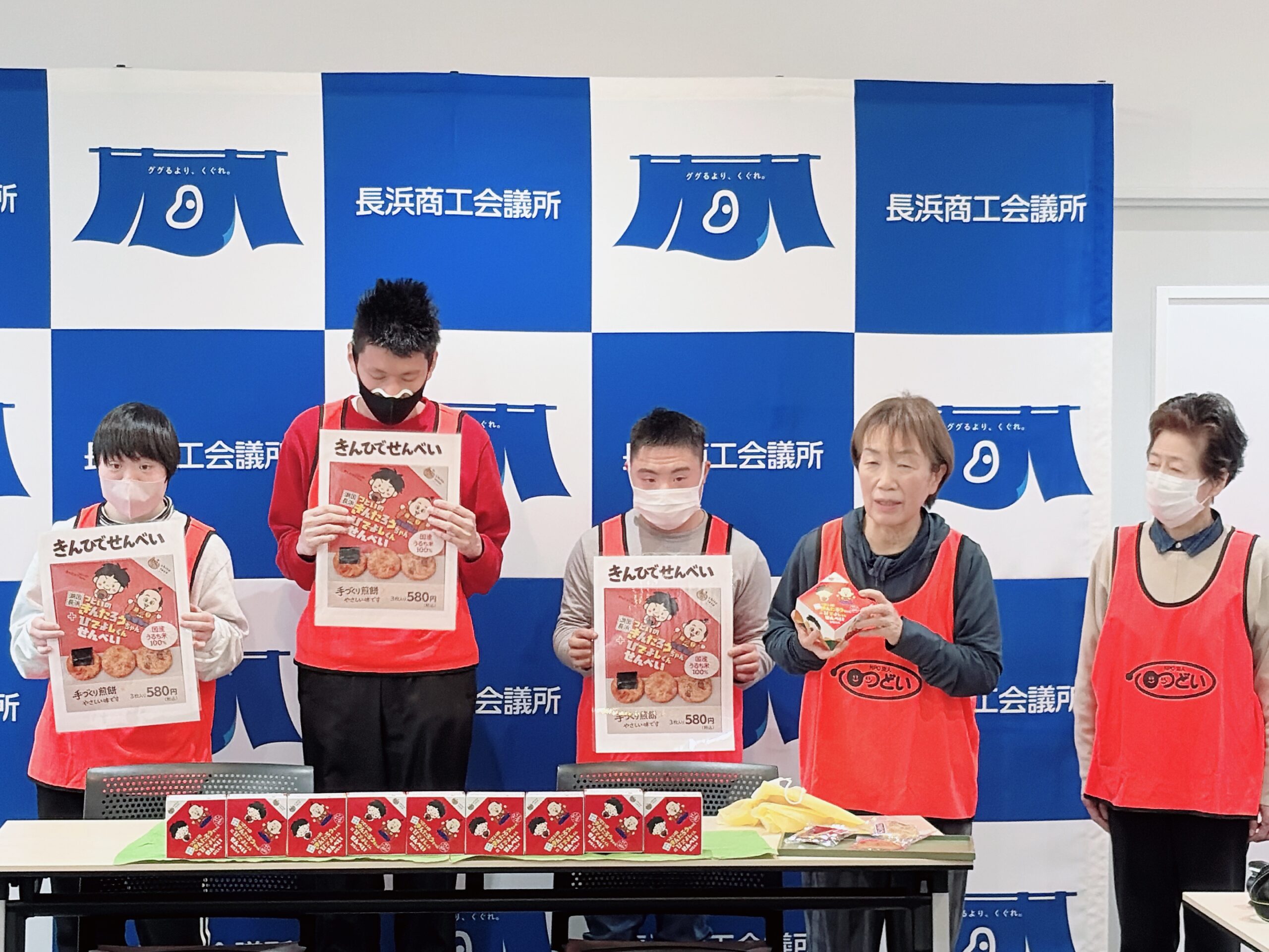 つどいのキャラクター「つどいのきんたろうちゃん」と長浜観光PRキャラクター「ひでよしくん」がコラボした新商品「きんひでせんべい」が発売されました!つどいは2020年、黒壁商店街で親しまれてきたせんべい事業を受け継ぎ、今年で6年目を迎えられます。日々の製造には、障がいのある方や高齢者など、働きづらさを抱える方々も関わり、一枚一枚丁寧に焼き上げています。今回の商品は、贈り物にも親しみやすい箱入りとして新たに誕生しました。国産米を使った厚焼きせんべいは、しっかりとした歯ごたえとお米の風味が特長で、「のり巻き」「ざらめ」「味しみかり」の3種類を詰め合わせています(^^)/