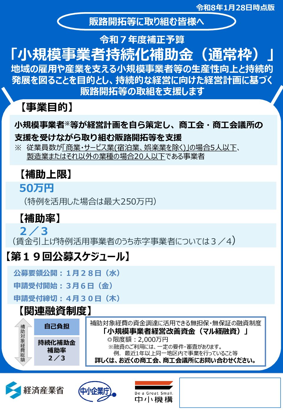 小規模事業者が計画する販路開拓等の取組に対して、その経費の一部を補助する国の「小規模事業者持続化補助金」について、第19回公募スケジュールが公開されました。