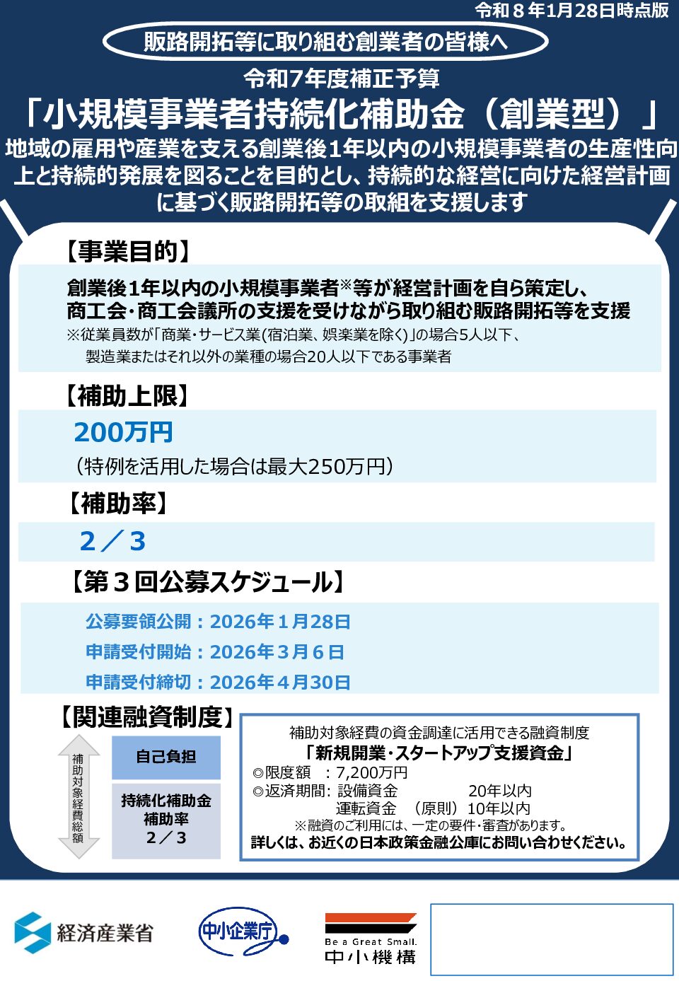 創業後1年以内の「特定創業支援等事業」による支援を受けた小規模事業者の持続的な経営に向けた経営計画に基づく販路開拓等の取組を支援するため、その経費の一部を補助する国の「小規模事業者持続化補助金」について、第3回公募スケジュールが公開されました。